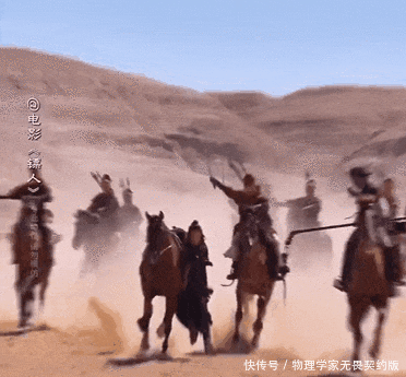 《镖人》中,吴京饰演的刀马为了躲避追兵们的冷箭,整个人都吊在了马上,跟着马一起跑,而在他的身边,还有许多正在奔跑中的马。